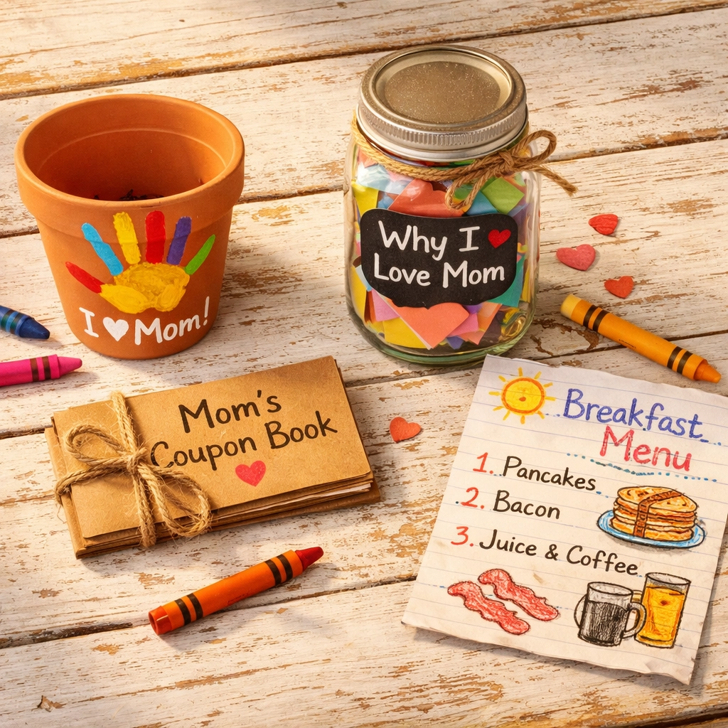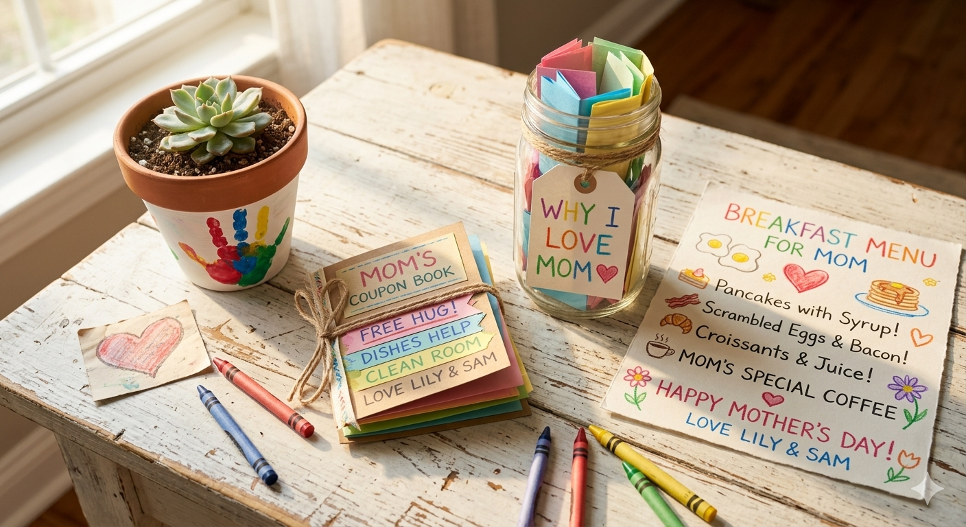 Kids write or draw little “coupons” for Mom — things like “One free hug,” “I’ll clean my room without being asked,” or “Breakfast in bed (cereal counts).” This is one of those Mother’s Day gift ideas from kids that truly scales with age — a five-year-old can draw their coupons, while a ten-year-old can write heartfelt ones that make Mom cry in the best way.