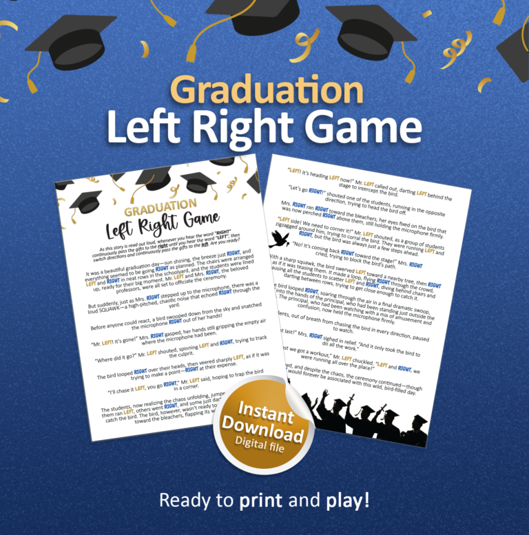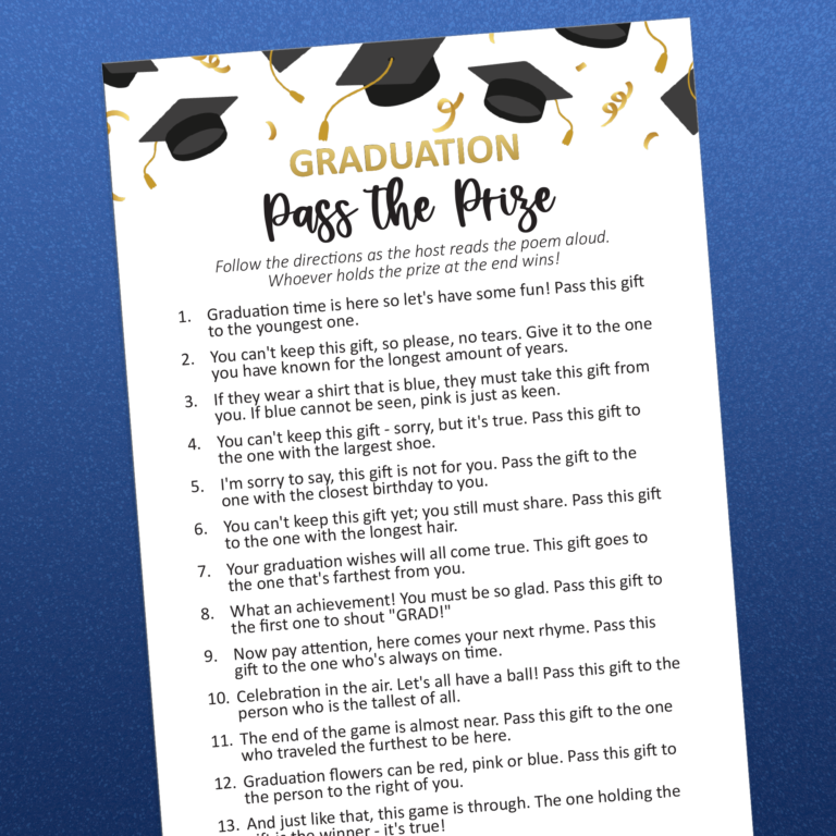 Pass the Prize is pure crowd-pleasing fun. The host reads a graduation-themed poem aloud, and every time guests hear a trigger word, they pass the prize to the person next to them — left or right, depending on the word. Whoever’s holding the prize when the poem ends wins it.