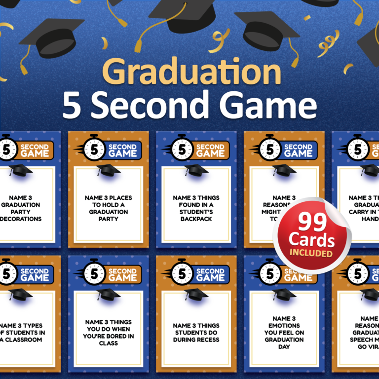 Fast. Loud. Hilarious. The 5-Second Game gives players just five seconds to name three things in a graduation-themed category. That’s it. Five seconds. It sounds easy until you’re actually on the spot and your mind goes completely blank.