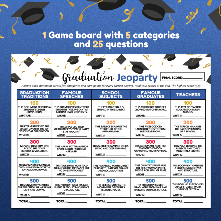 For the trivia lovers in the group, Graduation Jeoparty is a must. Players answer questions across five graduation-themed categories, earning points for each correct answer. The player with the highest total score wins.