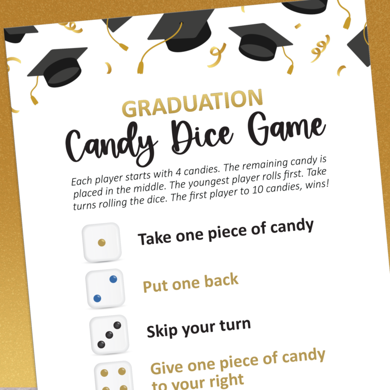 Dice + candy = instant crowd favourite. Players take turns rolling the dice and placing a piece of candy on the matching color of a graduation cap illustration. First player to fill their cap wins — and everyone gets to eat their candy at the end.