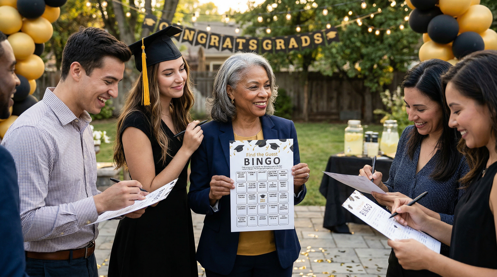 One thing learned from hosting and helping plan graduation parties is that the first 20 minutes make or break the whole event. If guests walk in and there’s nothing to engage with, people default to their phones and small clusters that never mix. But if something is already sitting on the table when they arrive — a game card, a prompt, a bingo sheet — people pick it up, and conversations start on their own.