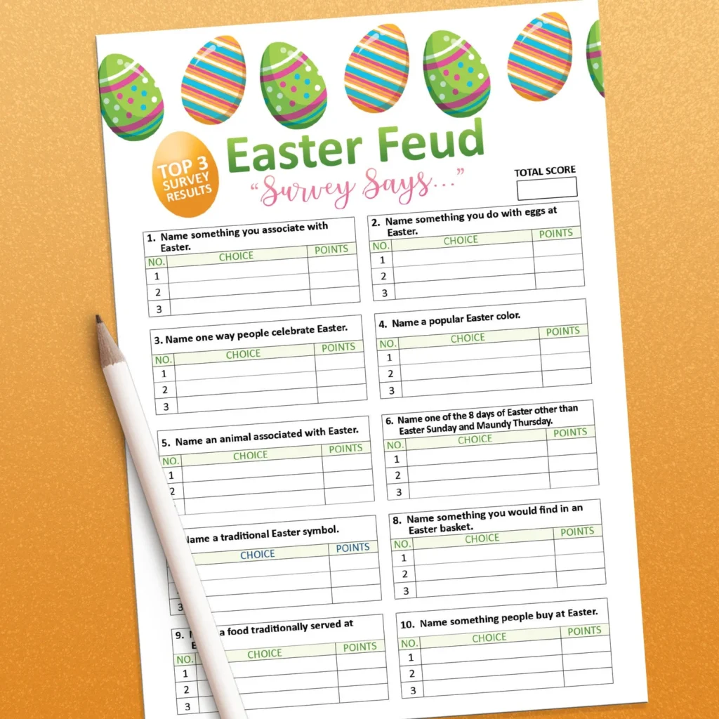 Games that encourage group participation and a bit of friendly competition are excellent for adult gatherings. Our Easter Feud game can be positioned as a support game that offers a competitive yet fun format, perfect for adult groups who enjoy a challenge. The survey-based questions are designed to spark engaging discussions and debates, making it a fantastic icebreaker and conversation starter. It’s about guessing popular answers, which often leads to hilarious revelations about how people think.