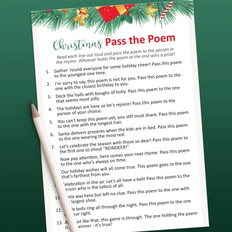 Looking for a game that’s both fun and sentimental? This one’s for you. Christmas Pass the Poem is a classic gift-passing game with a rhyming twist. As the host reads the festive poem, guests pass a gift to the left or right based on the instructions.